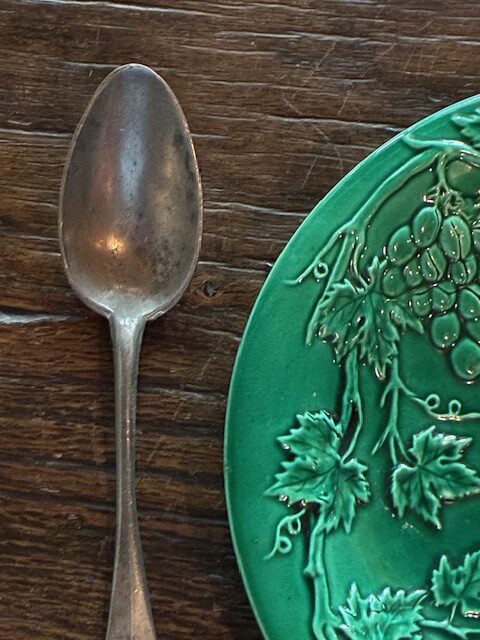 The French always add their little touch of unique shape and style to anything they made. Even something as simple as a spoon has its own personal style. I love mixing pewter with green majolica, something I’ve done from when I first opened showroom in 1990. If searching through English Dressers in ‘archives’, you’ll see several examples. This set of ten I found in my storeroom recently, I remember buying them from another dealer long ago and never used in my displays, not unusual!!! Anyway, they’re for sale now and half price. They’re now in my warehouse in Fitzroy North. 20cm – 8”