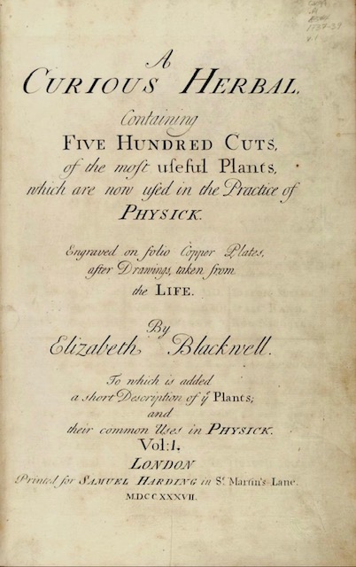 Elizabeth Blackwell (nee Blachrie) was among the first women to achieve fame as a botanical illustrator. She was born in Aberdeen in about 1700, but moved to London after she married. She undertook an ambitious project to raise money to pay her husband’s debts and release him from debtors’ prison.
