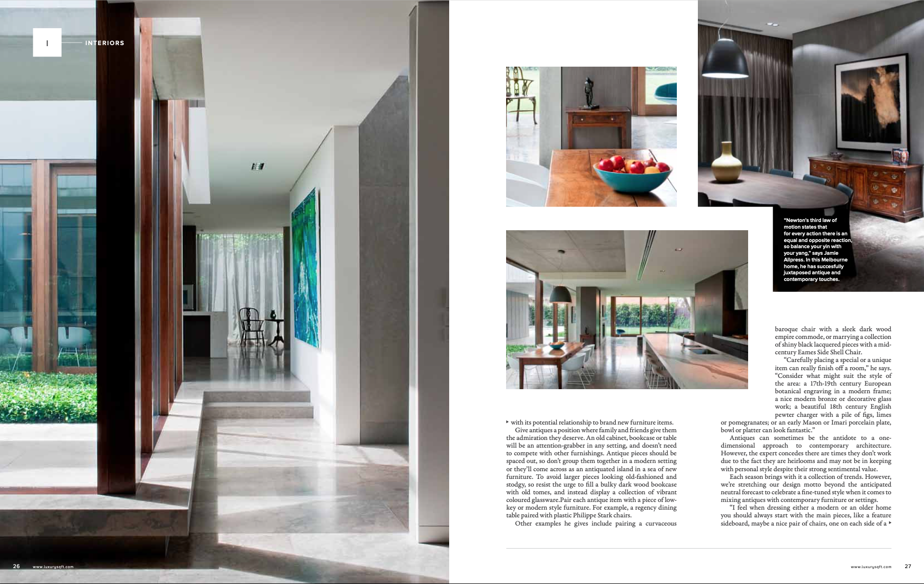 Decorating with antique furniture is all about how to mix the old with the new in a tasteful and well-balanced way. Consider achieving this interior concoction as not just an art, but a science. “Newton’s third law of motion states that for every action there is an equal and opposite reaction, so balance your yin with your yang.,” says Allpress. It’s about balancing the emotional connection to what may well be a family heirloom, with its potential relationship to brand new furniture items.