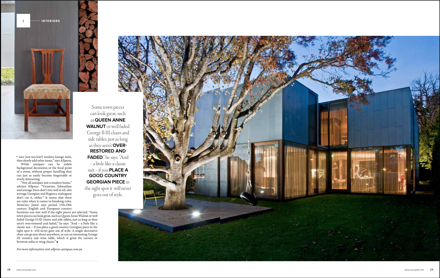 “Looking through magazines or real estate publications, I see a lot of same-same homes and interiors without much individuality,” says Allpress. “It’s easy to follow the herd into a huge contemporary retailer and your floor plan according to the display on the shop floor. However, placing a beautiful 18th century English oak dresser or sideboard with a large contemporary painting or photographic art hanging above creates an outstanding display that your eye is drawn to – and you won’t see that in any showroom.”
