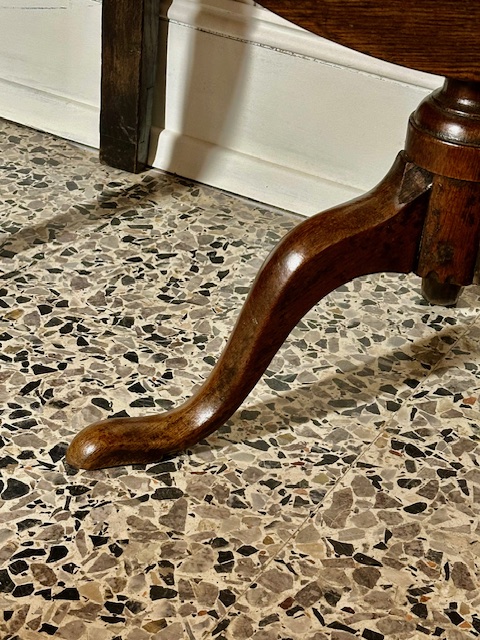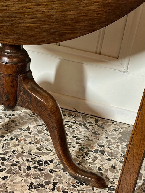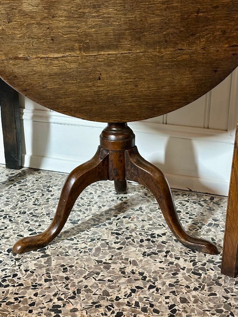 The well patinated circular top, above a well turned central support column, joined to refined out swept cabriole legs, terminating on a stylish pad-foot. Beautifully worn and well patinated. Other than a later replaced catch and a type of stain applied behind, revealing the untouched elm block. H.68cm W.76cm